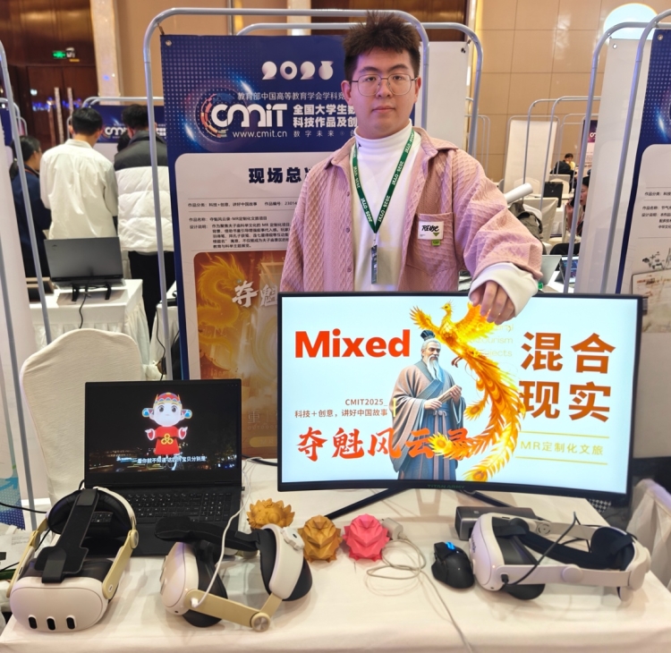 《夺魁风云录-MR定制化文旅项目》团队现场演示了混合现实场景下的沉浸式导览体验,并在问答环节中,对“虚实融合的实时定位精度”问题给出了基于视觉-惯性组合导航的系统解决方案,彰显出跨学科整合能力。